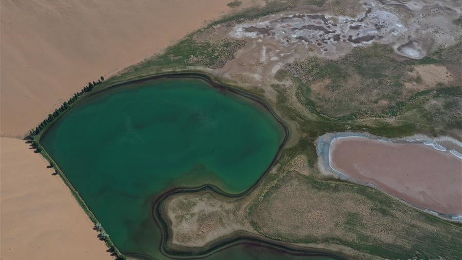 内蒙古自治区巴丹吉林沙漠腹地分布着形状各异的湖泊。湖泊点缀黄沙之中,成为别致的风景。