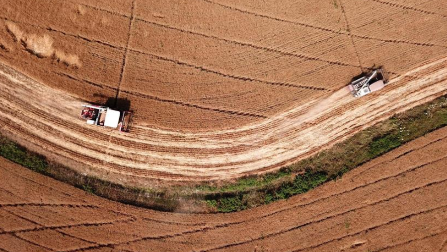 6月2日,在合肥市蜀山区小庙镇马岗村,农机手操作机械设备收割小麦。