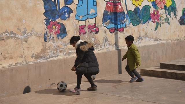 在海拔2700米高山上的瓦吾小学,一群孩子们在裸露着泥土的足球场上,追逐着滚动的足球,汗水浸湿了了衣服。