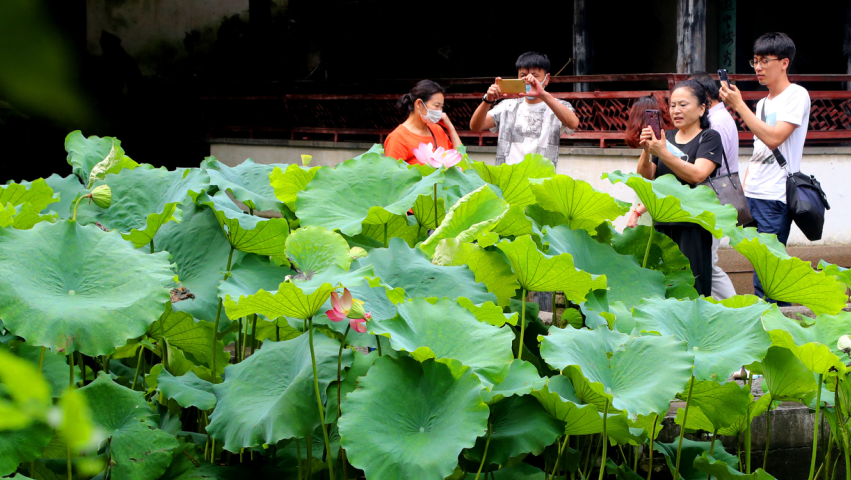 2020年7月18日,许多游客在塘荷叠翠的苏州古典园林拙政园消夏暑游。