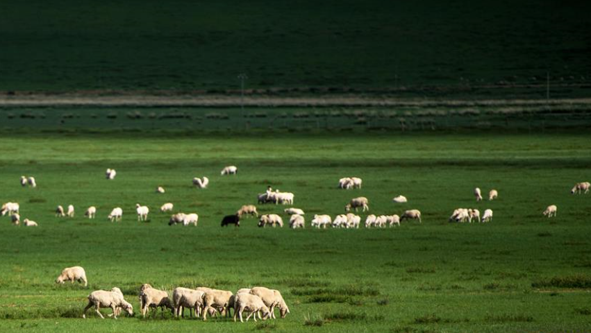 7月18日,羊群在内蒙古锡林郭勒盟正镶白旗境内的草原上觅食。