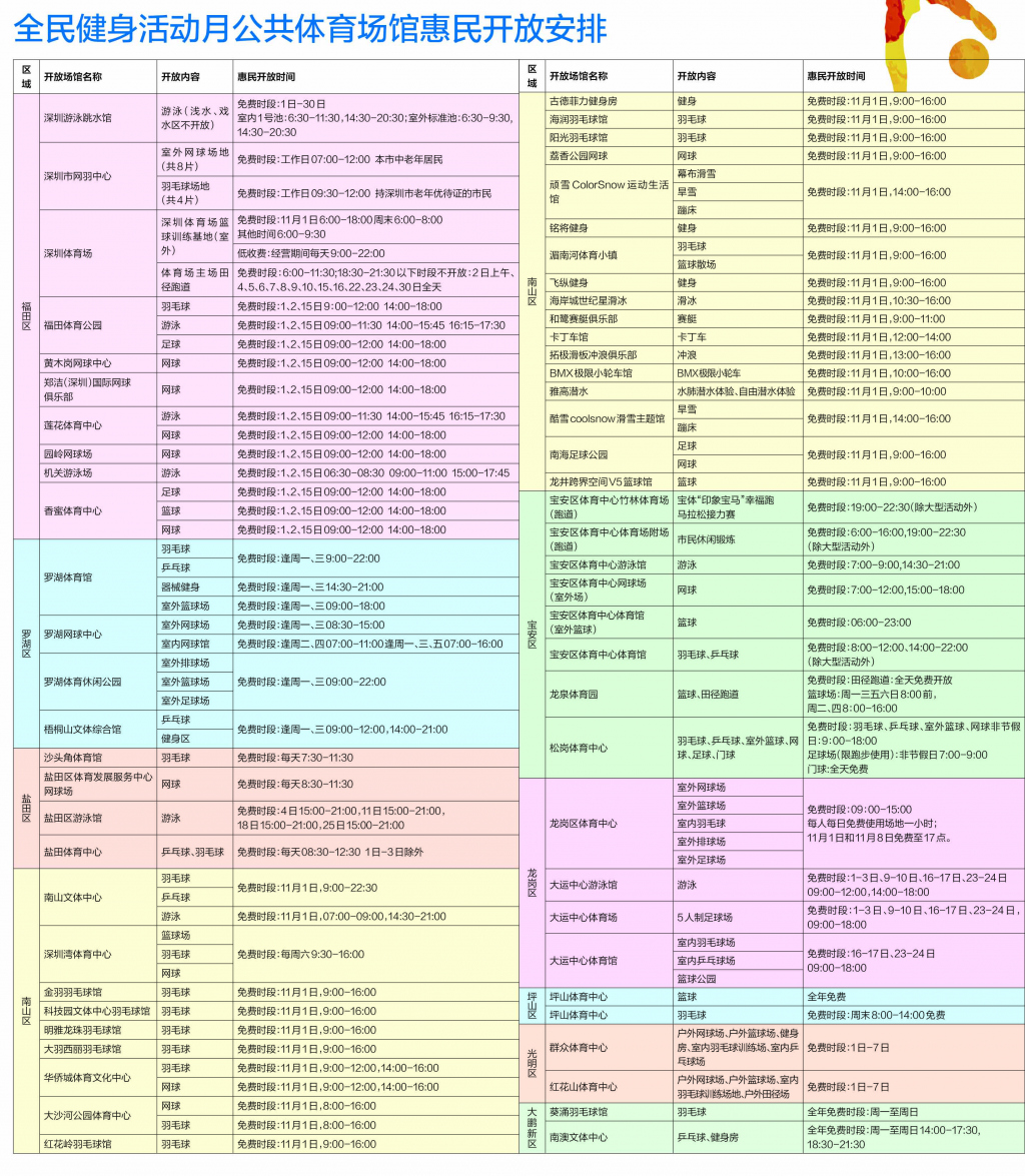 全市各区的公共体育场馆、体育设施和学校体育场地也将免费或优惠向市民开放,以满足广大群众的健身需求,丰富群众体育文化生活,吸引更多人群参加健身活动。值得注意的是,在今年免费开放的体育场馆中,不但有市区级建设的大型体育中心、体育馆,更有如机关游泳馆、华侨城体育中心、古德菲力健身房等几十余家社会体育场馆,政府主导,社会力量融入,全民健身范围得以大幅扩大。