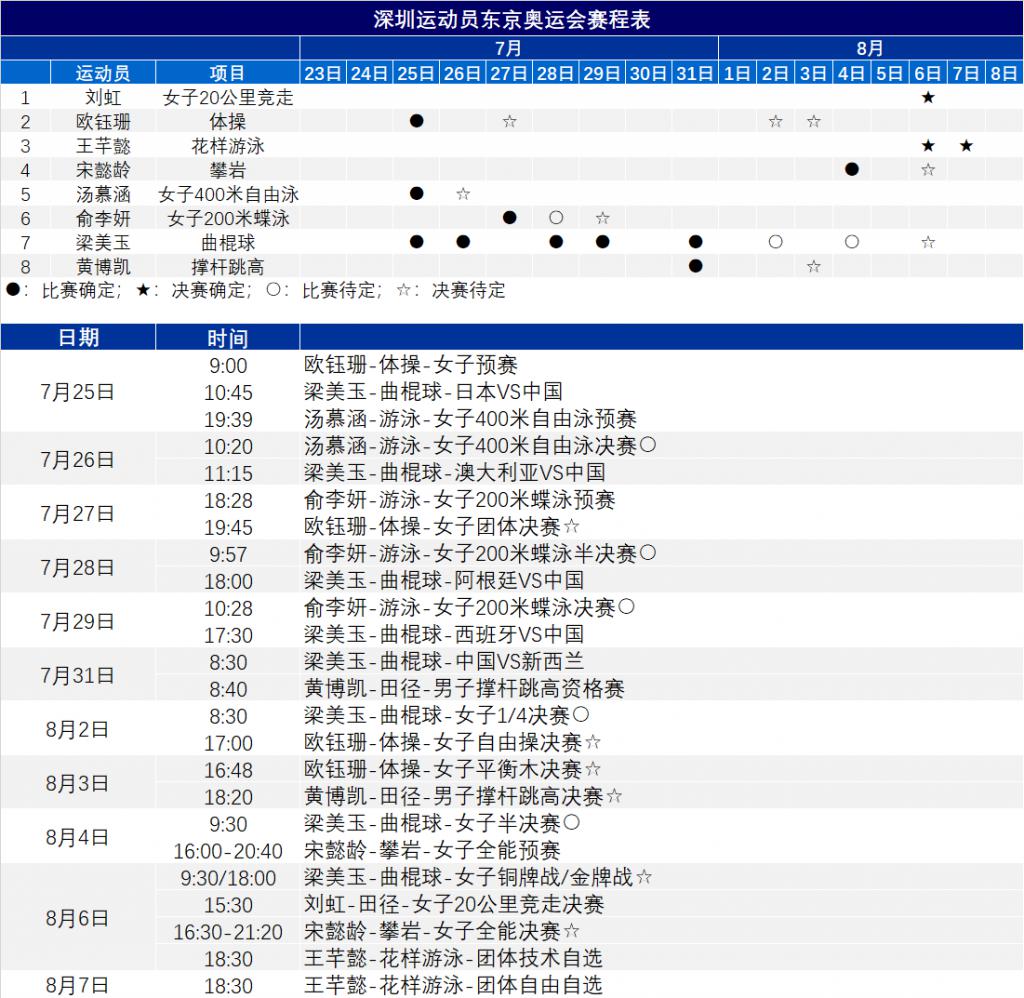 7月19日,深圳市文化广电旅游体育局整理公布了深圳健儿在东京奥运会上的比赛日历。