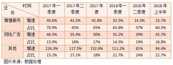 整体看来,收入格局并未发生明显改变,不过增值业务收入占比由2017年度的65%下滑至2018年上半年的60.5%,下滑了4.5个百分点,而其他业务收入占比上升了4.7个百分点。可见腾讯未来的看点在于核心业务的变化以及其他业务收入的变化。