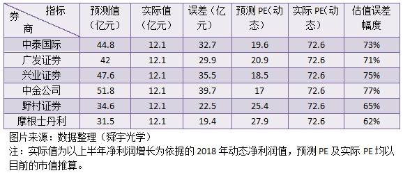舜宇光学的市值为998亿港元,仅为腾讯的3%,腾讯波动一个点的市值,就相当于舜宇光学波动33.3%,肯定比不了。不过以打脸的程度来说,舜宇光学有点过了,预测值与实际值的估值误差达70%左右,这脸打的确实响。