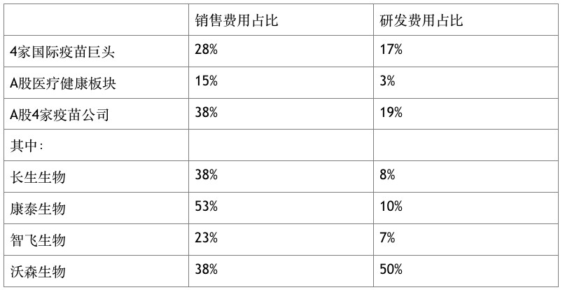 从科研投入来看,其与国际巨头亦存在巨大差距。以A股为例,目前上市有4家以疫苗为主业的企业。Wind数据显示,2017年4家疫苗公司总销售费用达18亿元,占营业收入38%;4家国际疫苗巨头(辉瑞、默沙东、赛诺菲、GSK)总销售费用占比28%。反观研发费用,A股医疗保健板块总研发费用319亿元,占总营业收入的2.8%;4家疫苗公司除沃森生物外,研发费用占比均未超过10%;4家国际疫苗巨头总研发费用占比17%。