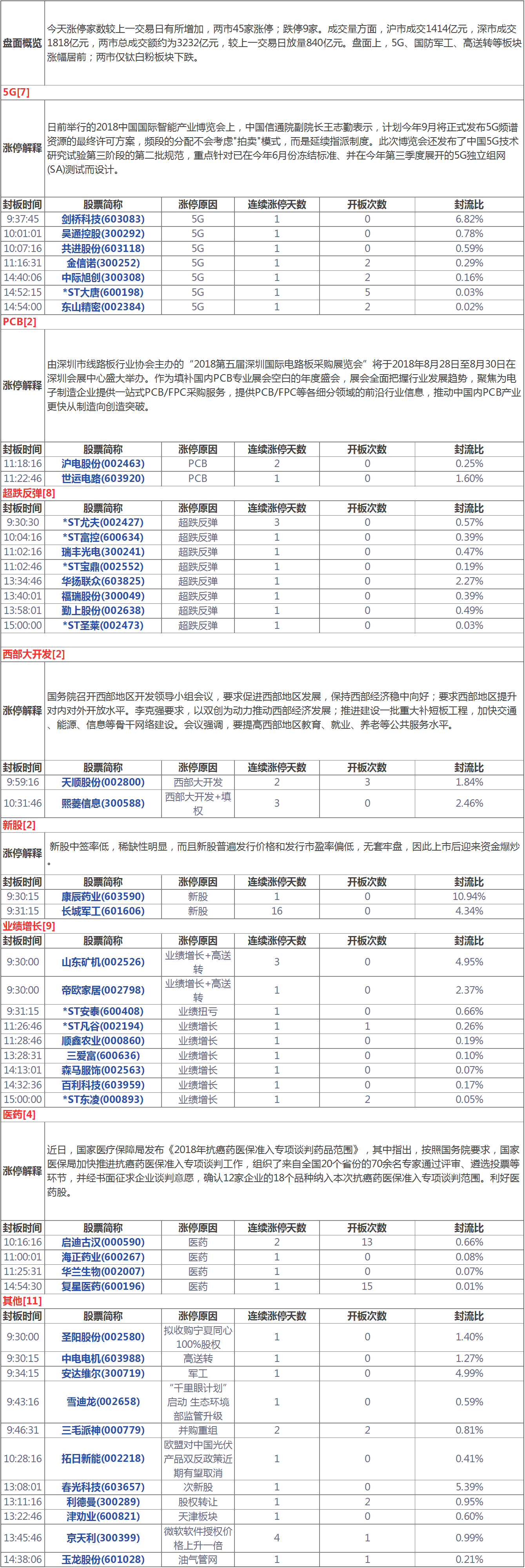 今天涨停家数较上一交易日有所增加,两市45家涨停;跌停9家。成交量方面,沪市成交1414亿元,深市成交1818亿元,两市总成交额约为3232亿元,较上一交易日放量840亿元。盘面上,5G、国防军工、高送转等板块涨幅居前;两市仅钛白粉板块下跌。