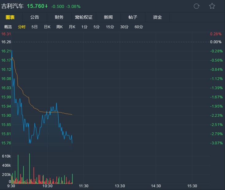 截至发稿,吉利报15.7港元,跌3.08%。(文文)