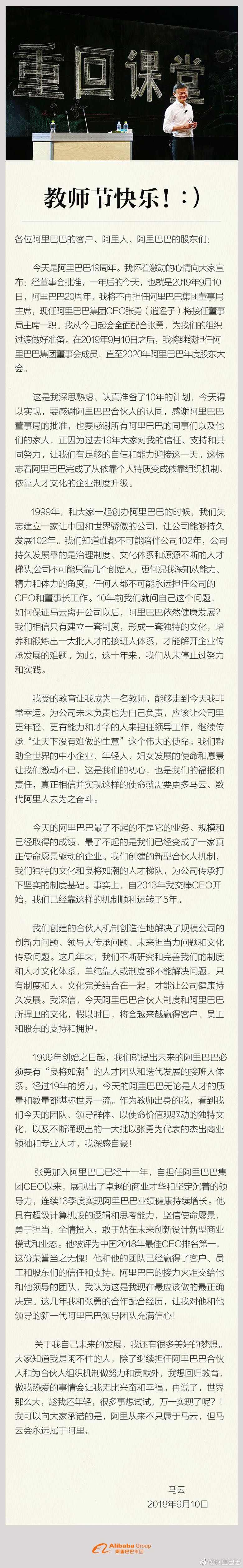 智通财经APP获悉,阿里巴巴官方微博和微信公众号均发布了一封马云的公开信,信中表示,一年后的阿里巴巴20周年之际,即2019年9月10日,他将不再担任集团董事局主席,届时由现任集团CEO张勇接任。