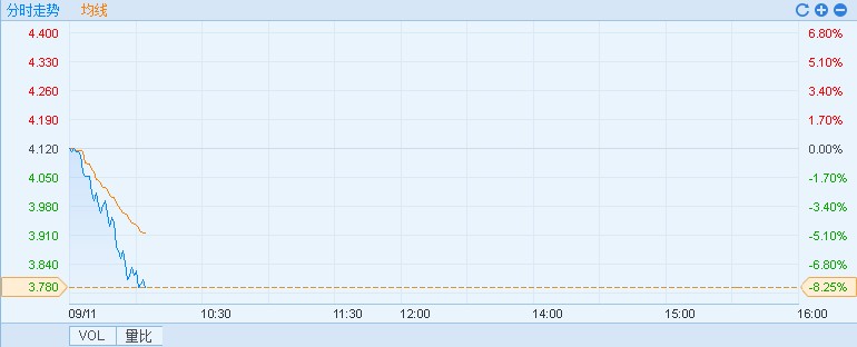 智通财经APP获悉,今日早盘A股钢铁板块低开低走,现钢铁板块跌超3%,马钢股份(600808)跌逾6%,受此影响,港股马鞍山钢铁股份(00323)也跟随下跌,截至10时02分,跌8.25%,报价3.78港元,成交额9244万。