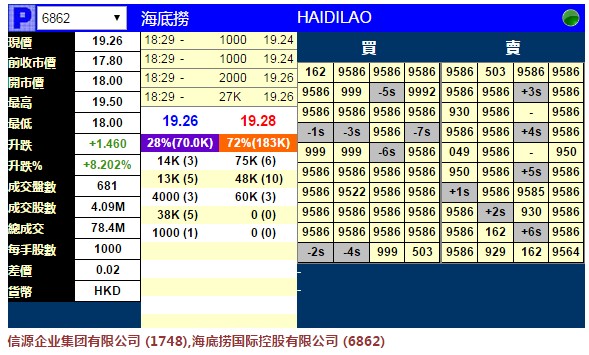 智通财经APP获悉,海底捞(03690)将于9月26日挂牌,上市前夕,据辉立交易场资料显示,暗盘收报19.26元,较招股价17.80元涨1.46元,涨8.20%。每手1000股,不计手续费,每手赚1460元。(文文)