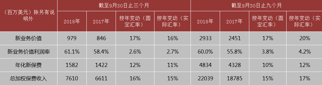11月9日,友邦保险控股有限公司(1299)公布截至2018年9月30日止第三财季业绩显示,报告期内,按固定汇率计算,公司新业务价值增长17%至9.79亿美元,年化新保费上升12%至15.82亿美元,新业务价值利润率增加2.6个百分点至61.1%,总加权保费收入上升16%至76.10亿美元。