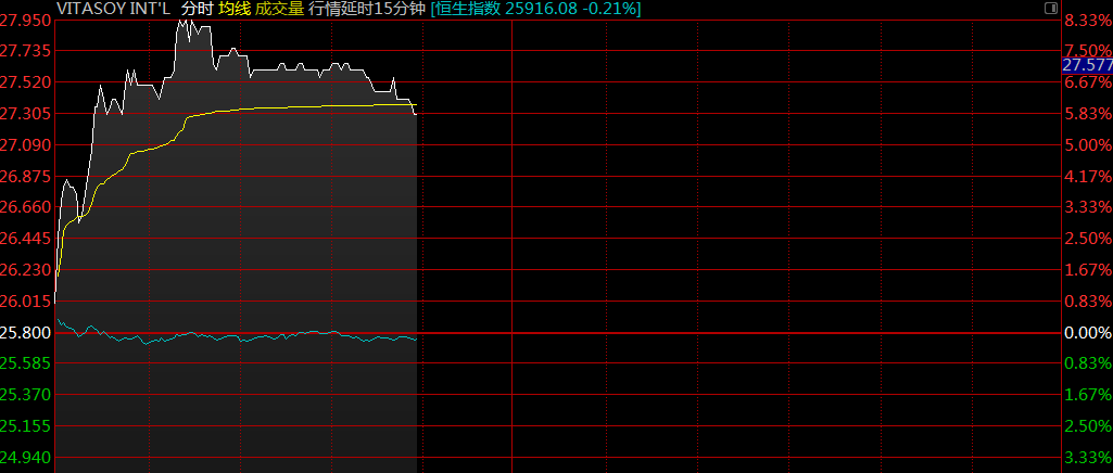 智通财经APP获悉,维他奶国际(00345)昨日午间公布中期业绩,中期股东应占利润同比增长30%至5.18亿港元,超市场预期。早盘股价涨势延续,截至9时56分,涨6.59%,报价27.5港元,成交额3661.58万。