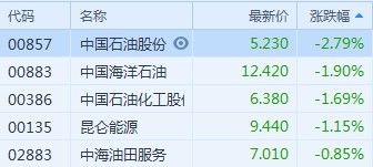 智通财经APP获悉,受国际油价下跌拖累,早盘石油股全线下滑,截至9时38分,中石油(00857)跌2.79%,报价5.23港元,中海油(00883)跌1.9%,报12.42港元,中石化(00386)跌1.69%,报6.38港元,昆仑能源(00135)跌1.15%,报9.44%港元。