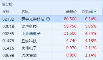 受益于G20结果超预期,早盘手机产业链全线反弹。舜宇光学(02382)涨6.34%,报80.5港元,瑞声科技(02018)涨5.95%,报58.75港元,比亚迪电子(00285)涨4.74%,报11.5港元。