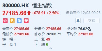 智通财经APP获悉,周日市场传来好消息,G20峰会上中美元首在贸易摩擦议题上,中美双方取得了积极进展,对股市来说是一个极大的利好,短期内市场投资氛围会得到改善。恒生指数开盘涨2.56%,报27185.66点。国企指数涨3.05%,报10945.67点。红筹指数涨2.29%,报4437.84点。大市盘前成交76.02亿港元。