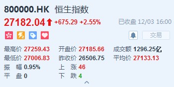 智通财经APP获悉,中美贸易摩擦忧虑减退,市场情绪得到提振,恒指早盘高开2.56%,报27185.66点。全日维持高位震荡,截至收盘,恒生指数涨675.29点或2.55%,报27182.04点,全日成交额达1296.25亿。国企指数涨2.45%,报10882.16点,红筹指数涨1.21%,报4391.2点。