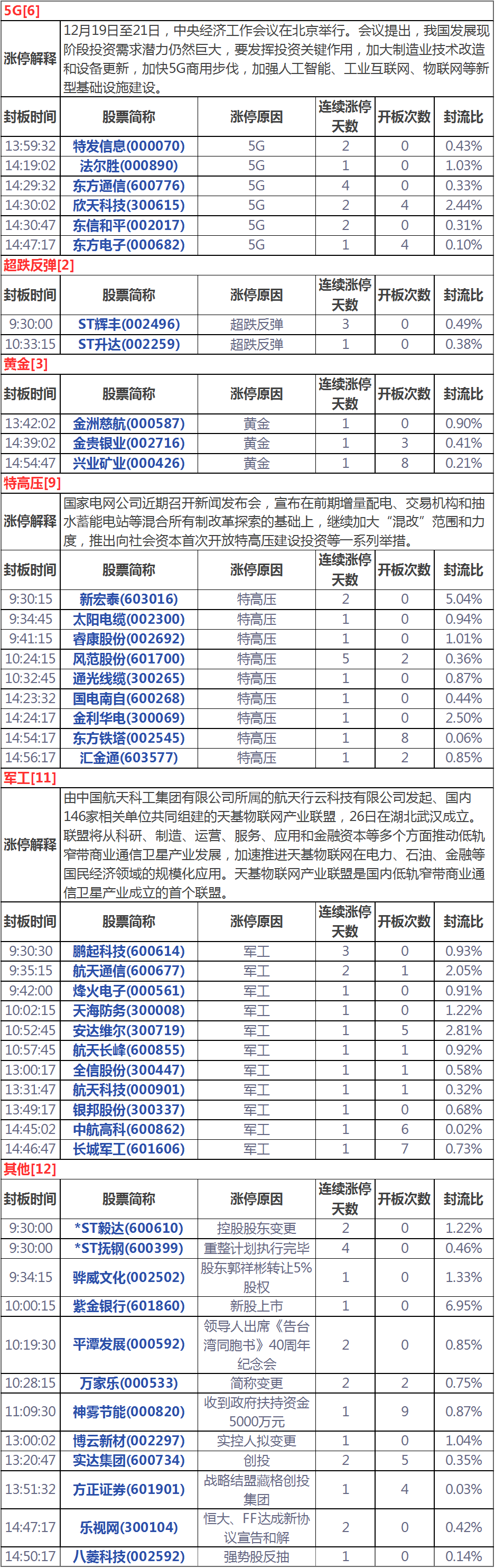 今天涨停家数较上一交易日增加,两市43家涨停,跌停24家。成交量方面,沪市成交1069亿元,深市成交1452亿元,两市总成交额约为2521元,较上一交易日放量259亿元。盘面上,军工、黄金、特高压等板块涨幅居前,5G、白酒、次新股等板块跌幅居前。