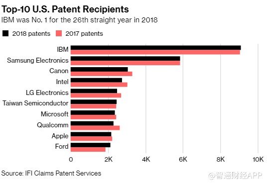 根据Fairview Research旗下IFI Claims Patent Services的分析,仅IBM一家公司就获得了9100项专利,保住了其第一名的位置,并将IBM的连胜时间延长到了26年。