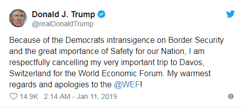 特朗普表示,由于民主党在边境安全问题上的顽固态度和国家安全的重要性,他谨慎地取消前往瑞士达沃斯参加世界经济论坛的行程,并向世界经济论坛致以问候和歉意。另外,美国政府高级官员表示,即使本月晚些时候政府仍处于关闭状态,美国财政部长姆努钦将带领美国政府代表团出席达沃斯论坛。