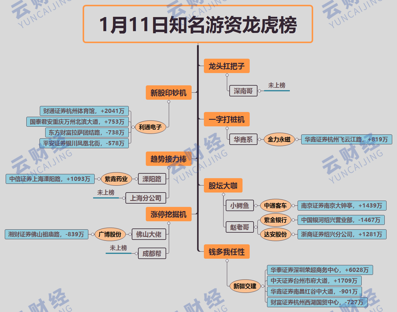 其他游资方面,赵老哥买入达安股份(300635)1281万卖出紫金银行(601860)1467万,小鳄鱼买入中通客车(000957)1439万,佛山帮卖出广博股份(002103)839万。
