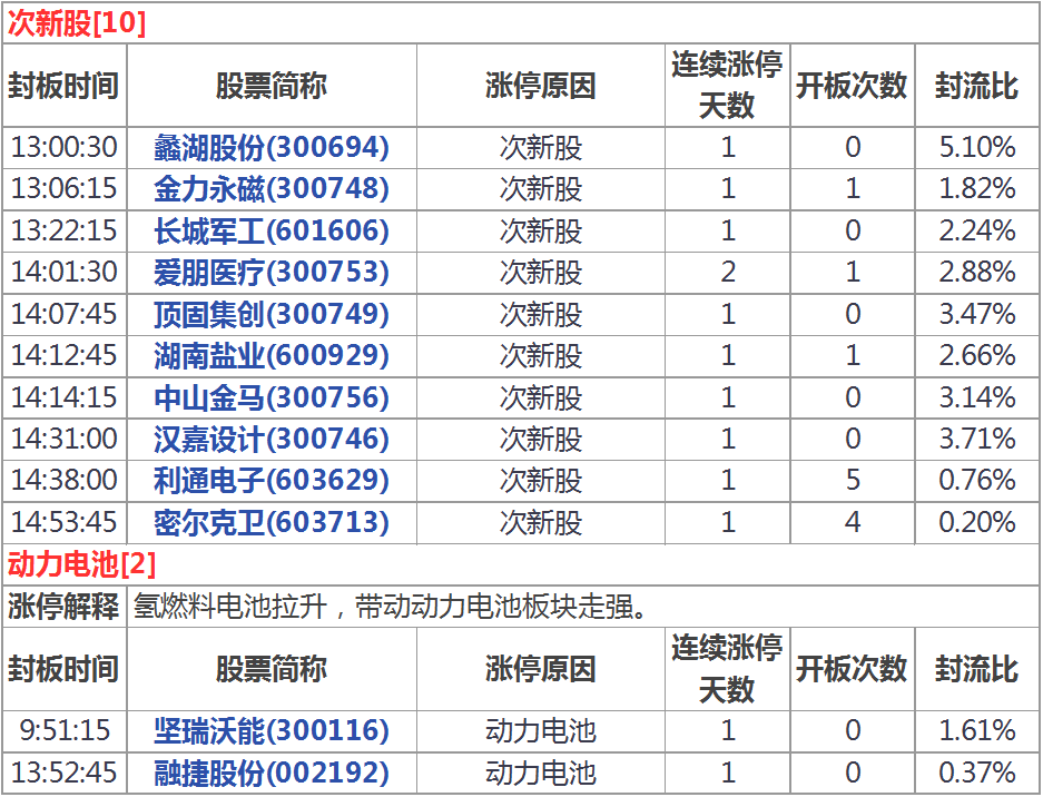 今天涨停家数较上一交易日有所增加,两市70家涨停;跌停8家。成交量方面,沪市成交1224亿元,深市成交1738亿元,两市总成交额约为2962元,较上一交易日缩量172亿元。盘面上,次新股、氢燃料电池、超导等板块涨幅居前,港口航运、彩票、智能音箱等板块跌幅居前。