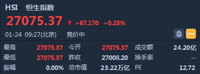智通财经APP获悉,恒生指数开盘高开0.25%,报27075.37点。国企指数涨0.31%,报10663.49点。红筹指数涨0.64%,报4328.62点。大市盘前成交24.21亿港元。隔夜美股震荡收高,港股ADR全日偏软。市场对月底中美谈判有所憧憬。