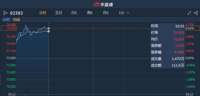 智通财经APP获悉,华为推出首款5G芯片,5G的不断消息刺激,助力手机产业链近两日持续走高,截至10时32分,舜宇光学(02382)涨4.11%,报价76港元,成交额3.31亿。截至发稿,瑞声科技(02018)两日累涨近6%。(王岳川)