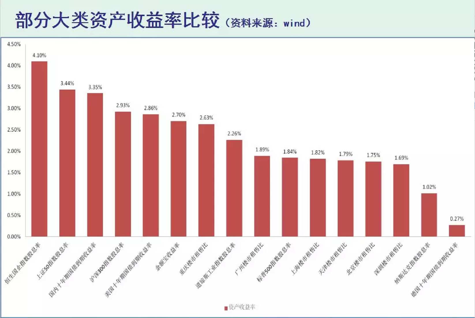 买恒生国企可以有4.1%的收益率,上证50有3.44%的收益率,10期国债是3.14%的收益率,然而,买上海、北京的房产,收益率分别是1.82%、1.75%,买深圳的房产收益率更是只有1.69%。作为对比,余额宝的收益率都有2.7%。