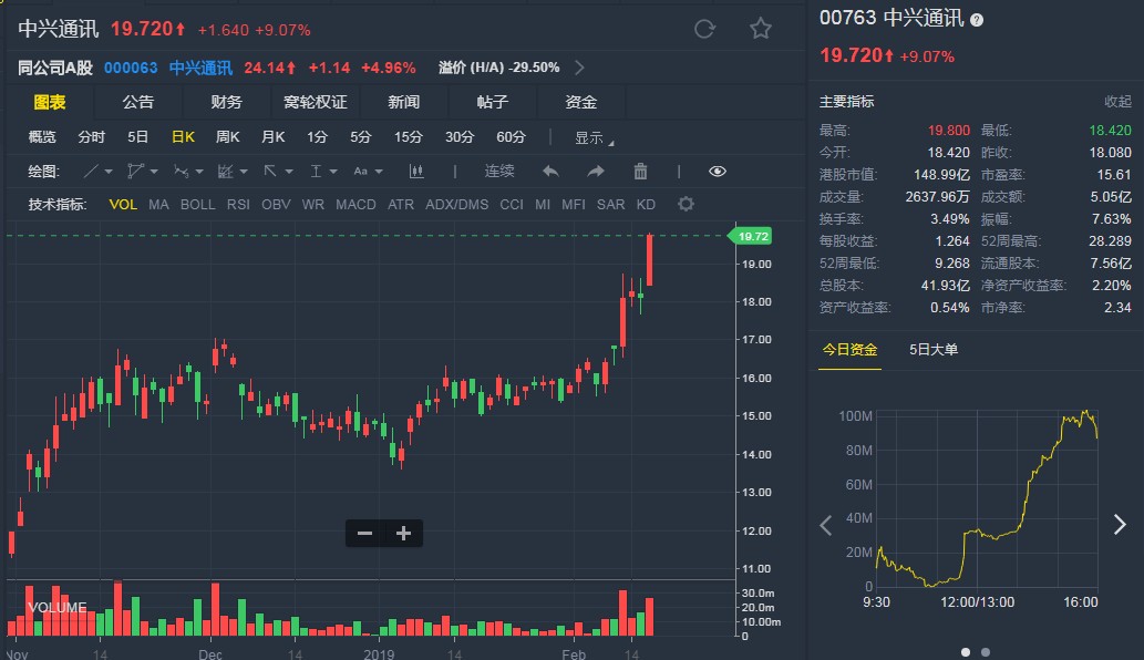 截至发稿,中兴通讯(00763)涨9.07%,报19.720港元。(刘大洋)