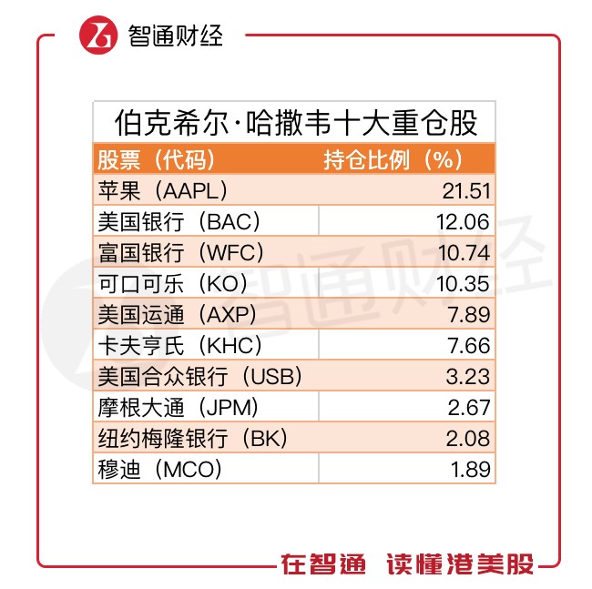 截至12月末,伯克希尔的十大重仓股分别为苹果、美国银行、富国银行、可口可乐、美国运通、卡夫亨氏、美国合众银行、摩根大通、纽约梅隆银行及穆迪。