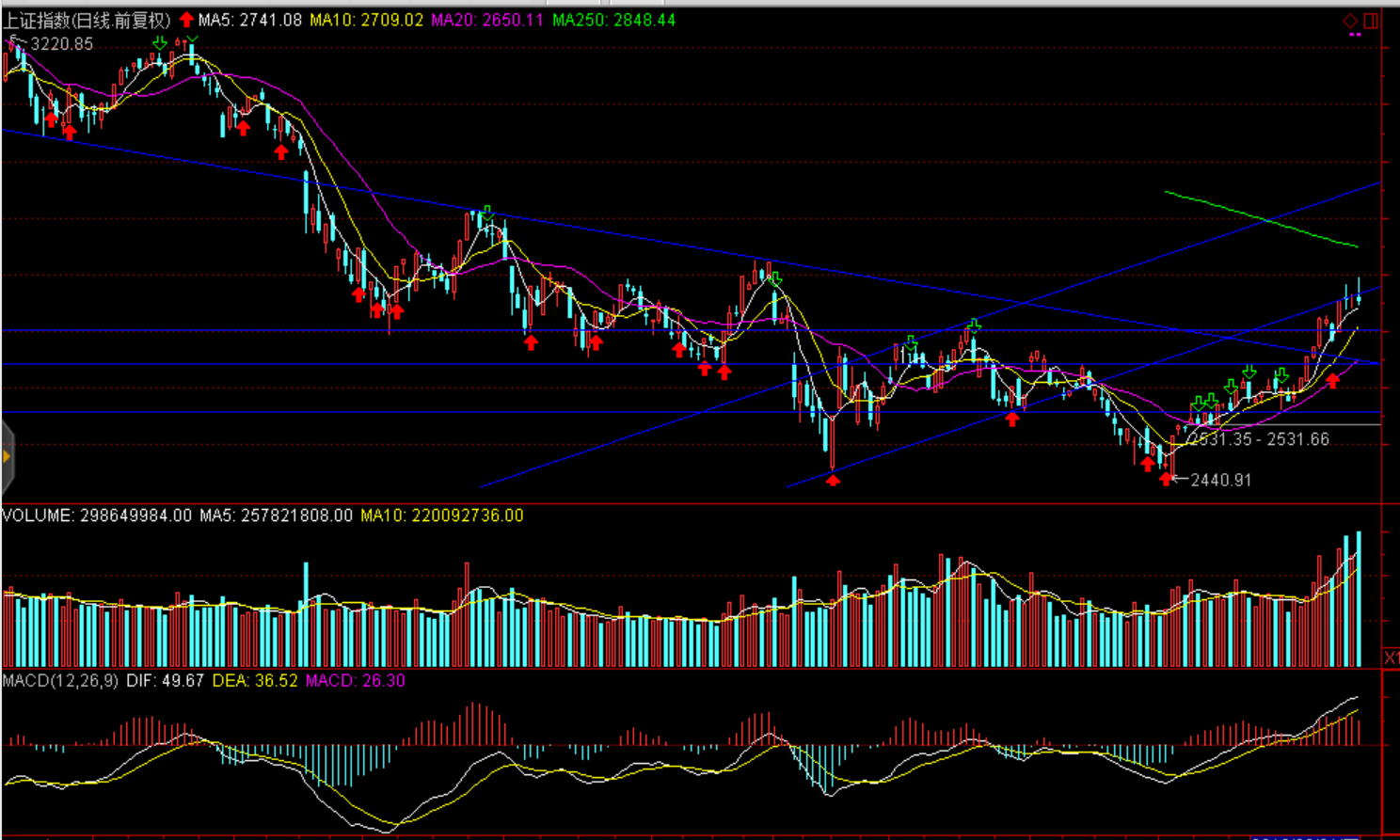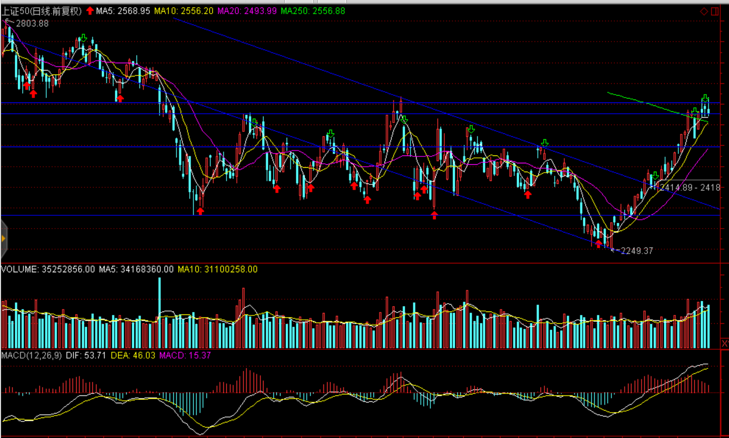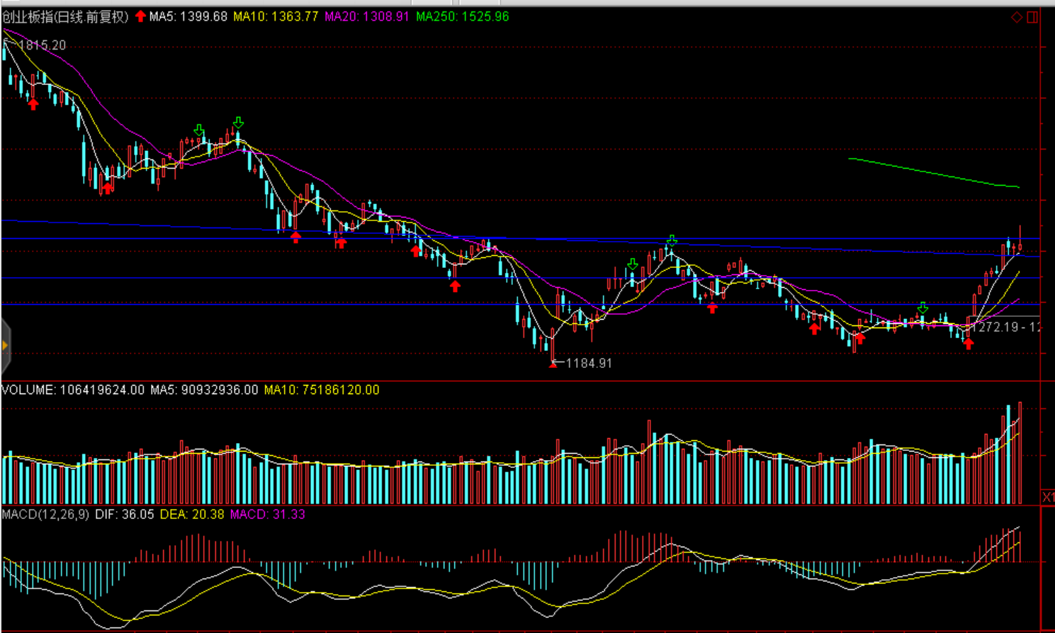 技术面:周线七连阳后放量震荡,上档空间有限,沪综指年线构成强压力,创业板1500点一线强压力,预计今日两市股指反弹、沪综指压力2806点、创业板1455点。