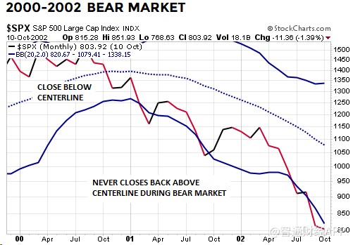 在2007年10月股市见顶之后,标普500指数在2008年1月收于布林通道月线中轨以下,在熊市期间都无法重新回到布林通道中轨以上。2008年6月标普500指数收于下轨以下: