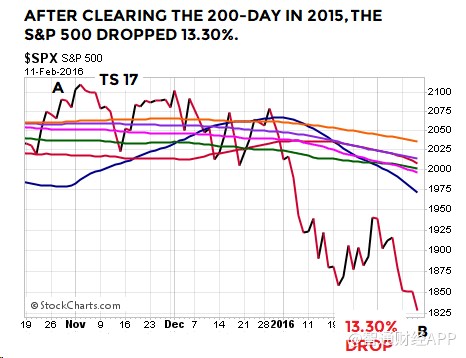 收高于200日均线并非安全信号。2015年,标普500指数连续8个交易日收于200日上方,但随后下跌了13.30%:
