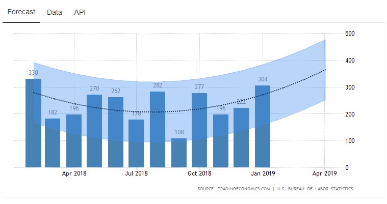 根据Trading Economics的预测,2月非农数据将会延续1月的势头,呈现上行趋势。