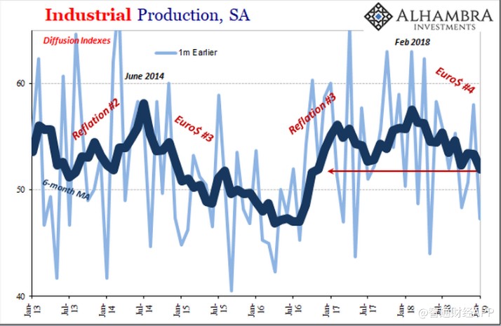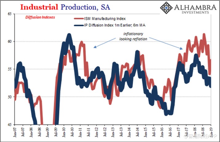 美联储计算了一个扩散指数(滞后一个月,即更新后的扩散指数为2019年1月)作为其工业生产数据的一部分。月度数据表现不稳定,但平均而言在时间和解读上是明确无误的。即使是ISM制造业的PMI的走势也几乎跟随美联储扩散指数。