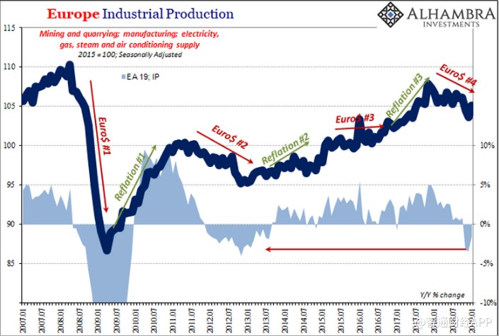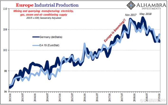 欧盟统计局对整个欧洲工业生产的估计,包括从德国收集的工业生产和重新利用的工业生产数据显示,欧洲的产量在过去三个月中(11月、12月、1月)同比增速均出现下降,触及2012 -13年经济衰退以来低点。