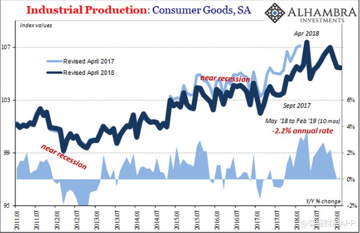 美国制造业,特别是消费品行业,与欧洲(以及中国)行业发展形势趋同。追溯到去年五月,美国商品行业几乎没有增长。就消费品而言(更接近经济放缓的权重),它与欧洲出现的完全萎缩状况非常相似。