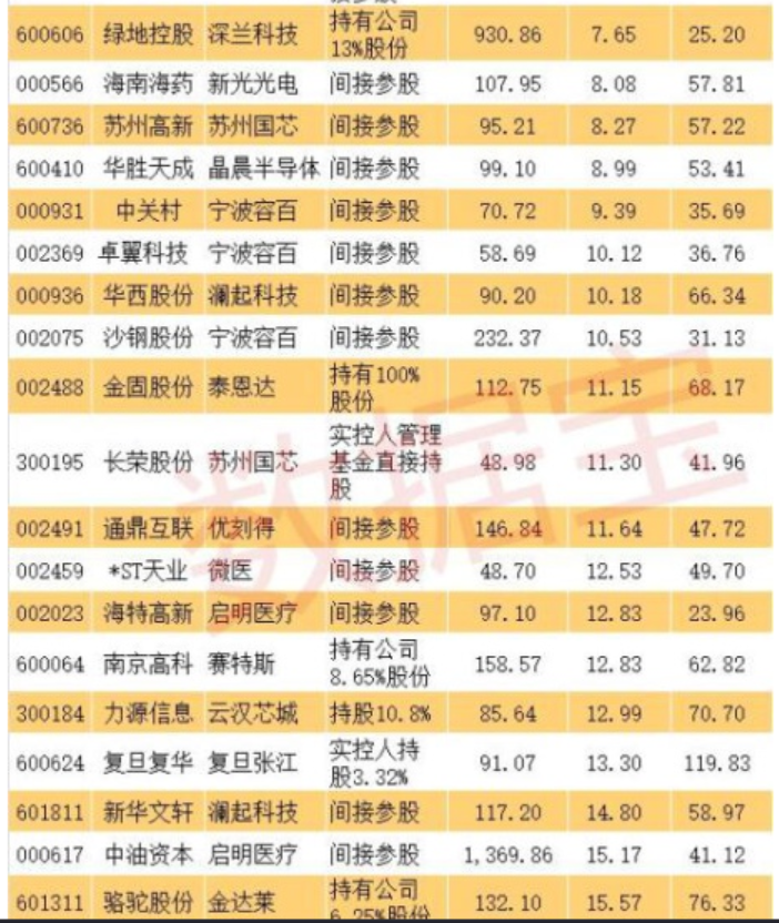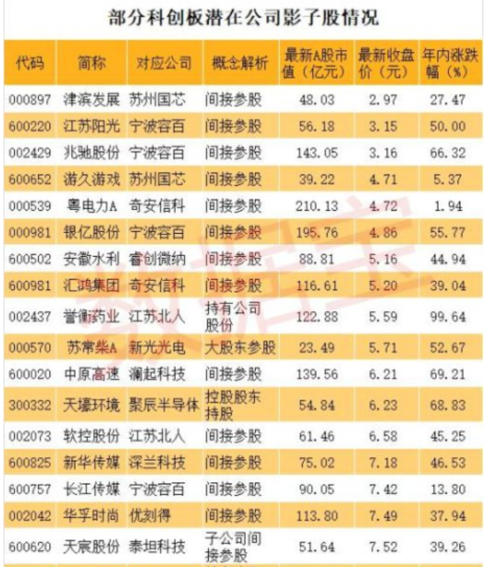 科创板影子股:首批创业板潜在公司背后有超过50只影子股,而这些影子股大多是间接持股。从持股比例来看,最大的是金固股份,持有泰恩达100%股权。其他影子股持股比例较大的还有,通化东宝持有33.94%特宝生物、上海医药持有26%复旦张江、三六零持有22.59%奇安信科、张江高科间接持有10.78%上海微电子、绿地控股持有13%深兰科技、力源信息持有10.8%云汉芯城、科大国创持有10.15%誉存科技、南京高科持有8.65%赛特斯、骆驼股份持有6.25%金达莱等。