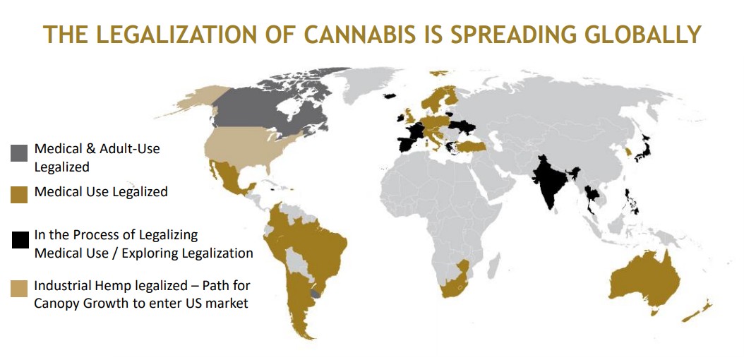 下图是全球最大的工业大麻生产商CANOPY GROWTH披露的全球大麻推广情况图,从中可以很清晰的看到这一新兴行业政策解禁的进程,而且基本可以确定的是,未来灰色的区域会越来越少。