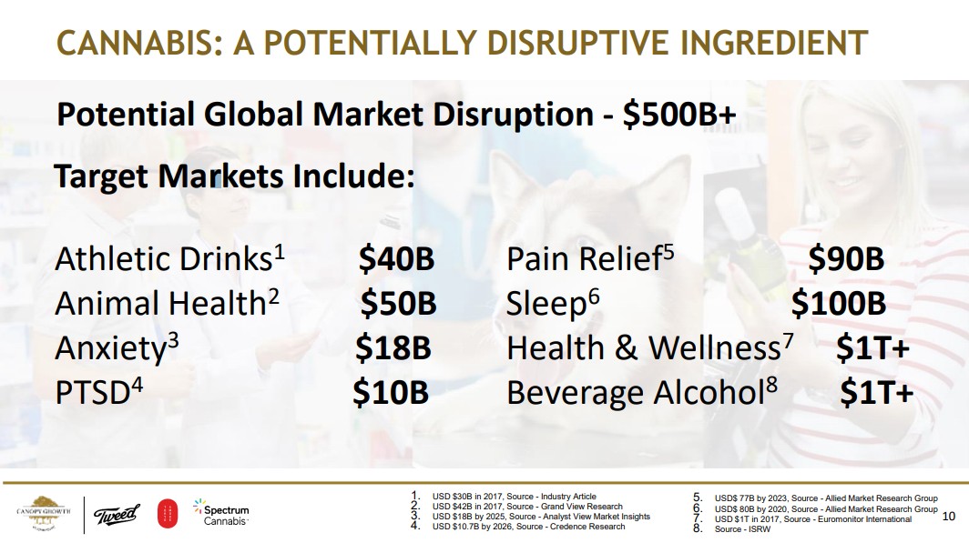 CANOPY GROWTH根据Allied Market Research Group等调研机构按照不同用途做了一组测算,未来该行业的将会渗透全球至少5000亿美元的市场: