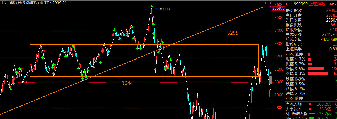 上证指数日K线看,缺口跌破了日K中枢的下轨,这里会对反弹产生较大压力,关注3044点的反压。
