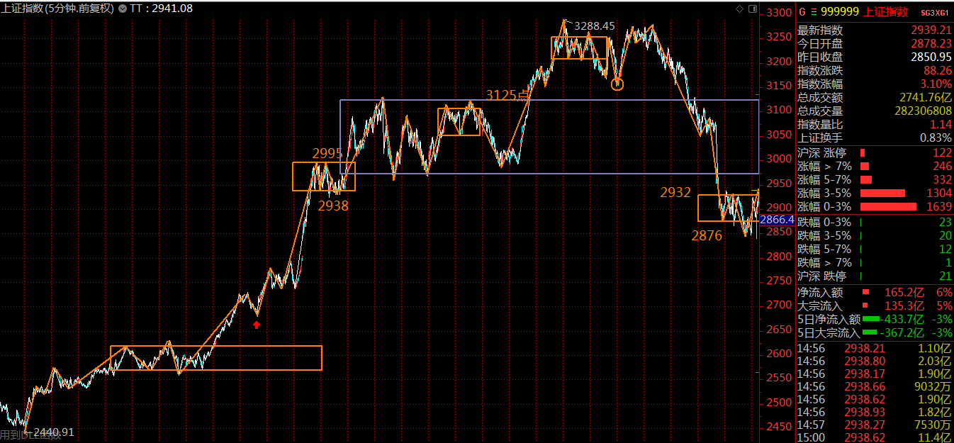 再看5分钟级别走势结构,在特朗普的帮助下,这里直接跌穿了三月份构建的三十分钟级别中枢,力度较大。周五逆转趋势后,在三十分钟中枢下面,完成了这段下跌趋势第二个五分钟中枢的构建工作。大概率宣告了这段五分钟下跌趋势的终结。下周一、周二,上证指数面临了上方30分钟中枢下轨2968点的反压,可能会出现回落,投资者可逢低吸纳。