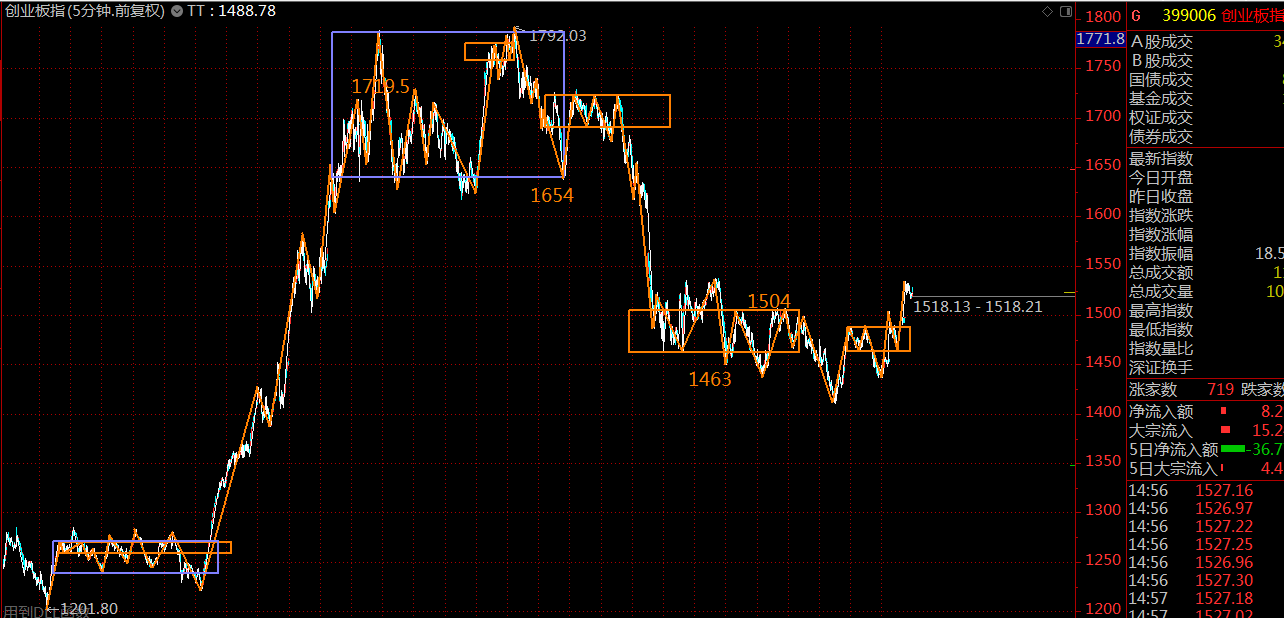 创业板空间可能相对较大,压力位在1654点附近,这里同样是处在五分钟上涨趋势中,耐心持股待涨,直至出现五分钟趋势背驰为止。