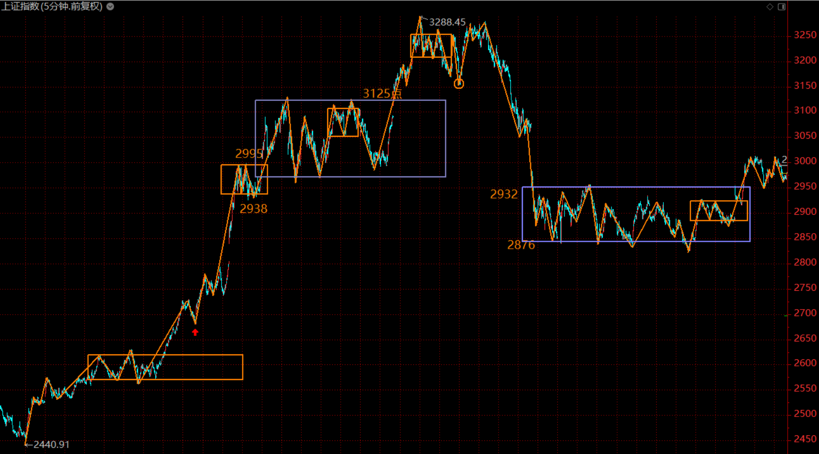 市场已进入下跌趋势的初期,本周初将会反弹,构建五分钟上涨趋势的第二类卖点,在3050附近没有获利了结的投资者,注意这次卖出良机,降低仓位以防范风险。耐心等待市场回到2900附近再行布局。