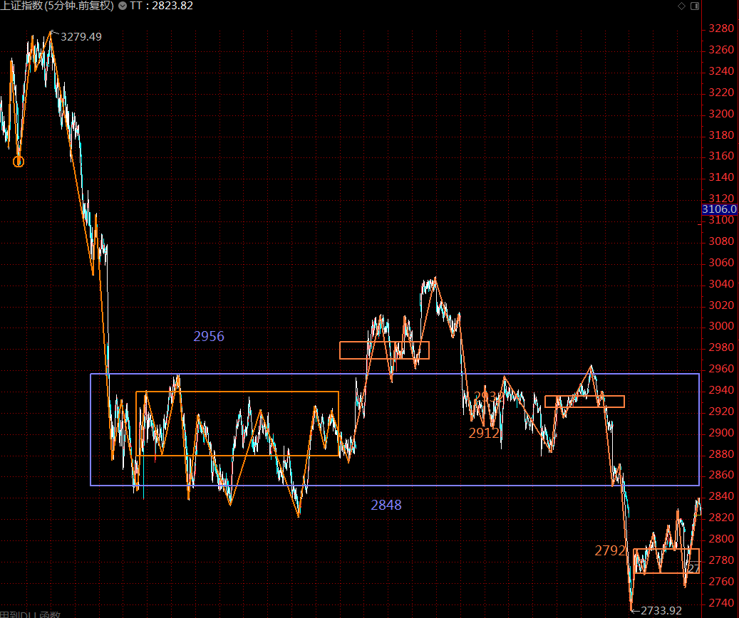 上周市场整体都处在构建第三类卖点的阶段,周五的高点2840目前初步确认为第三类卖点的精确位置,如果就此转下,下一步2792点就显得尤为重要,如果往下的五分钟线段未能跌破2792点,那这个位置是一个合理的建仓点,等同于针对下方三十分钟中枢(九段扩张)的第三类买点。