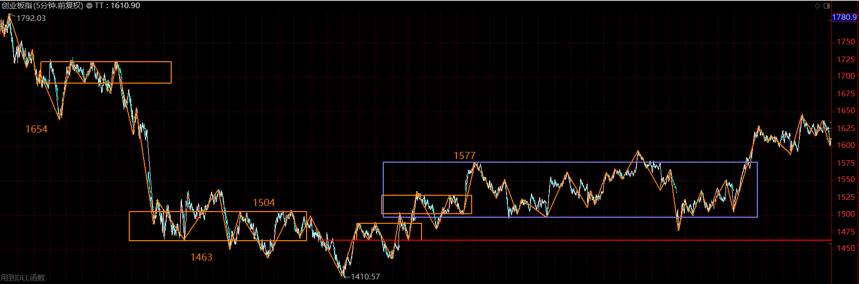创业板指数依旧强势,这里在构建30分钟级别的三买,以1577点为界,如果回调不破,则这里将是创业板主升行情的起点。如若重新跌回中枢内部,则按中枢震荡处理。创业板走势要强于主板很多,后续行情多半仍然围绕创业板展开。