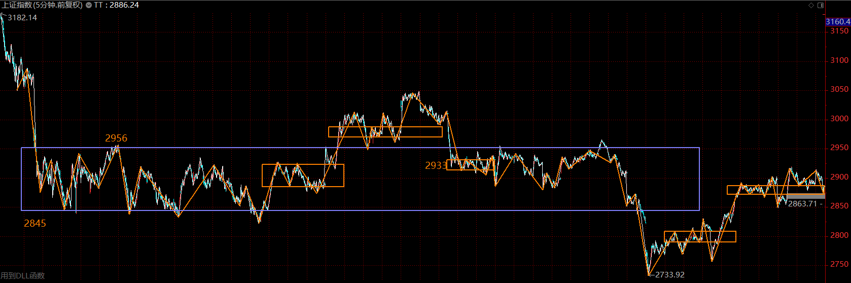 上证指数上周在这个位置做中枢扩展,将五分钟上涨的第二个中枢扩展为三十分钟级别的。这是强势的一种表现,市场在震荡中消化抛压。这里需关注大中枢的下轨2845点,跌破后,可能会带来指数的二次探底,这将是绝佳的加仓点位,不跌破则市场随时会上攻2950点。目前态势下,应以持仓为主。