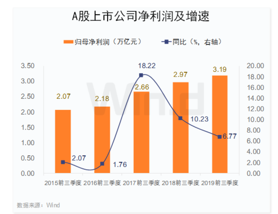 2019年前三季度A股上市公司合计实现营业总收入35.83万亿元,同比增长8.65%;实现净利润(备注:以下统计均为归属母公司净利润)3.19万亿元,同比增长6.77%。