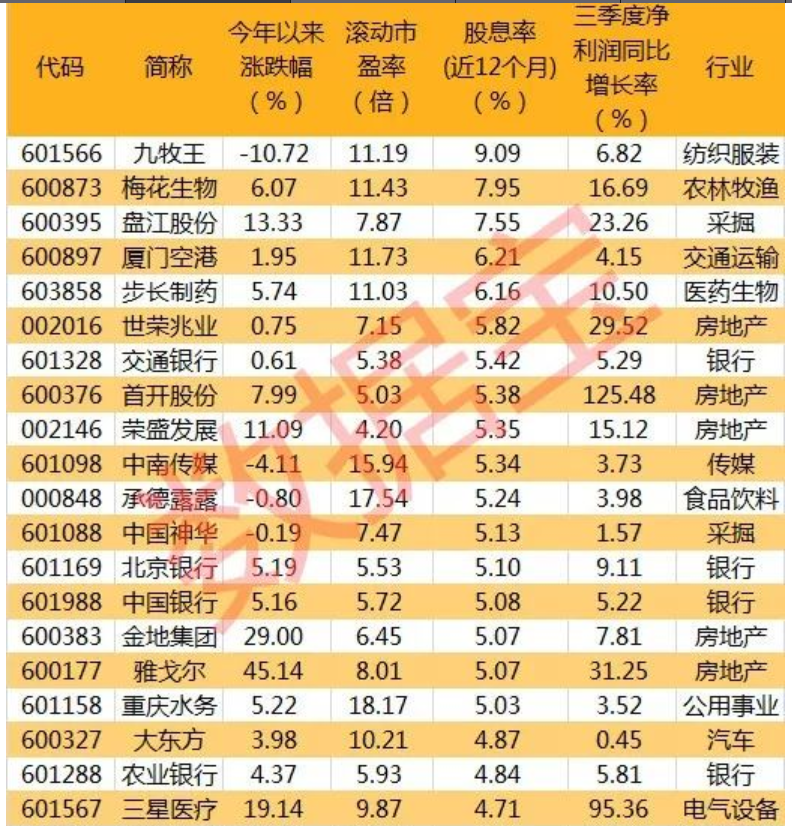 3、高股息率股票贵在稳健、安全,长期看,即使市场出现长期调整,高股息个股也可以给投资者带来稳定的现金收入;目前高股息率个股的整体估值较低,根据以下条件筛选高股息率潜力股:1、滚动市盈率小于20倍;2、2016、2017、2018连续三年股息率大于4%;3、最近12个月股息率大于4%;4、前三季度净利润同比增长。